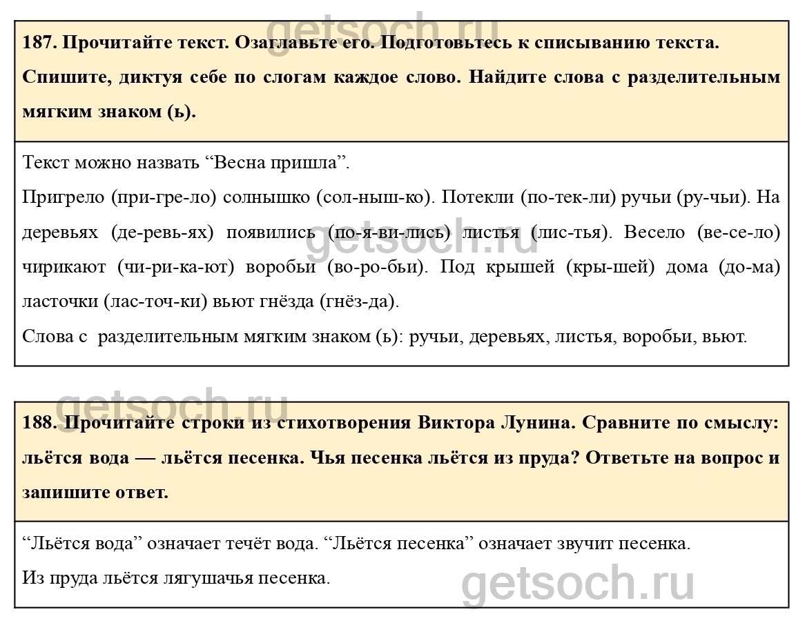 188. Прочитайте строки из стихотворения Виктора Лунина. Сравните по смыслу: льётся вода — льётся песенка. Чья песенка льётся из пруда? Ответьте на вопрос и запишите ответ.