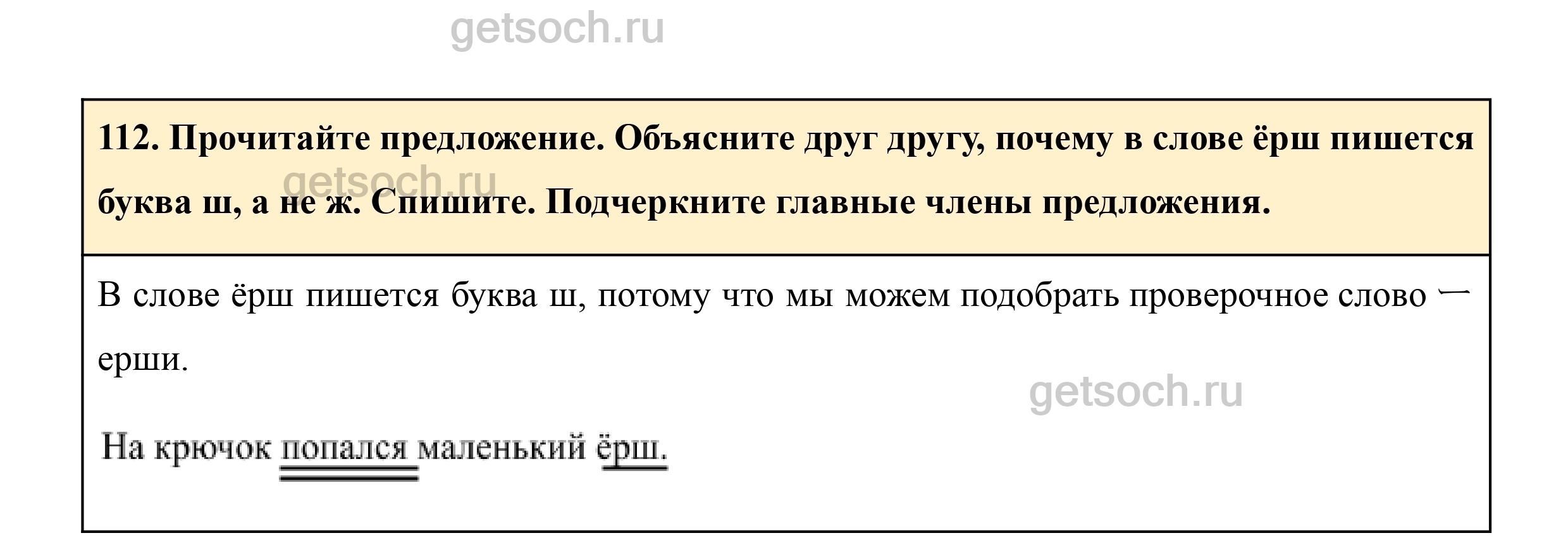 112. Прочитайте предложение. Объясните друг другу, почему в слове ёрш пишется буква ш, а не ж. Спишите. Подчеркните главные члены предложения.