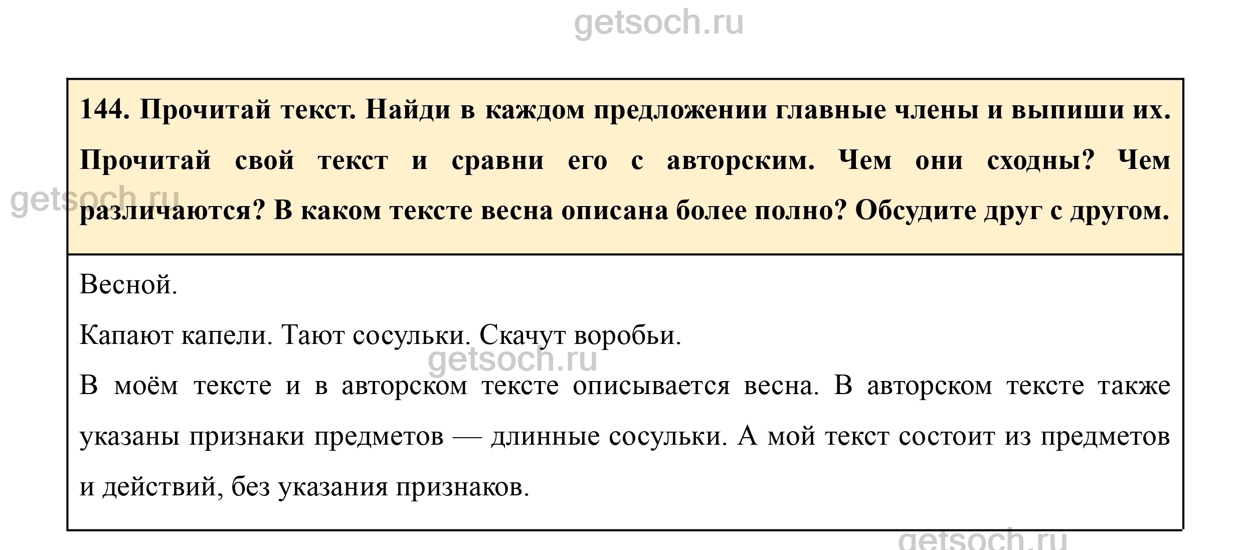 144. Прочитай текст. Найди в каждом предложении главные члены и выпиши их. Прочитай свой текст и сравни его с авторским. Чем они сходны? Чем различаются? В каком тексте весна описана более полно? Обсудите друг с другом.