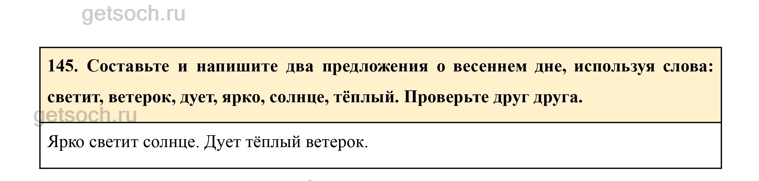 145. Составьте и напишите два предложения о весеннем дне, используя слова: светит, ветерок, дует, ярко, солнце, тёплый. Проверьте друг друга.