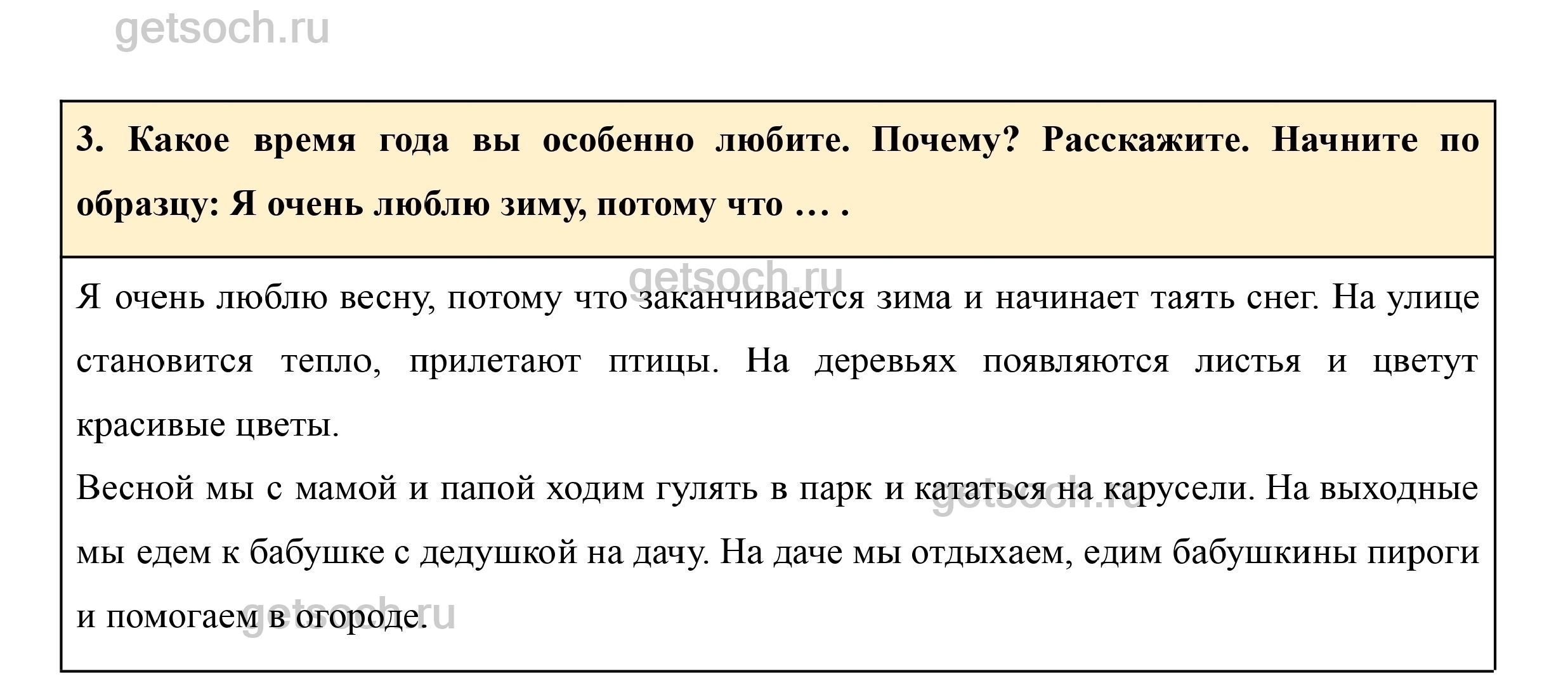 3. Какое время года вы особенно любите. Почему? Расскажите. Начните по образцу: Я очень люблю зиму, потому что … .