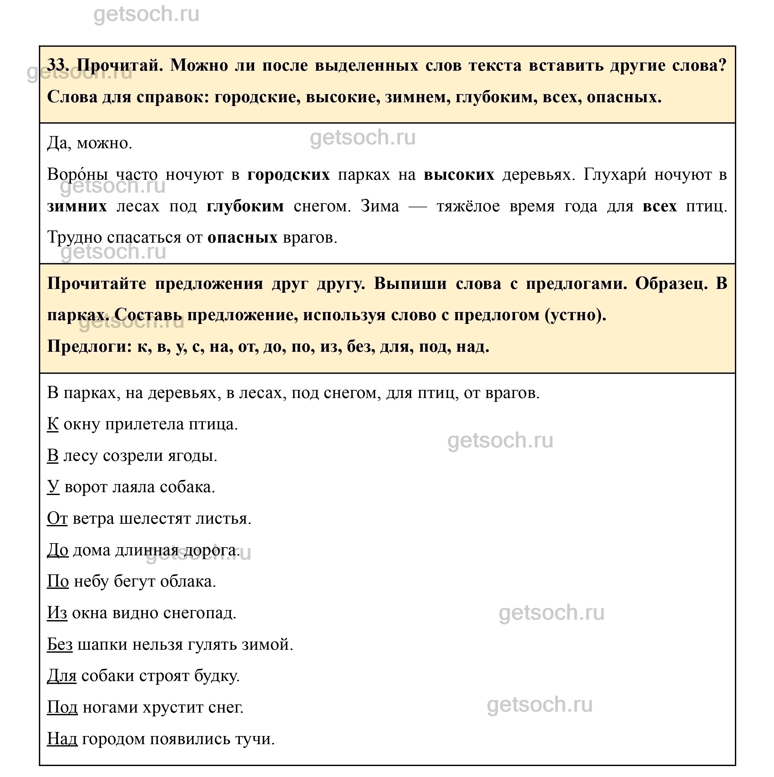 33. Прочитай. Можно ли после выделенных слов текста вставить другие слова? Слова для справок: городские, высокие, зимнем, глубоким, всех, опасных.