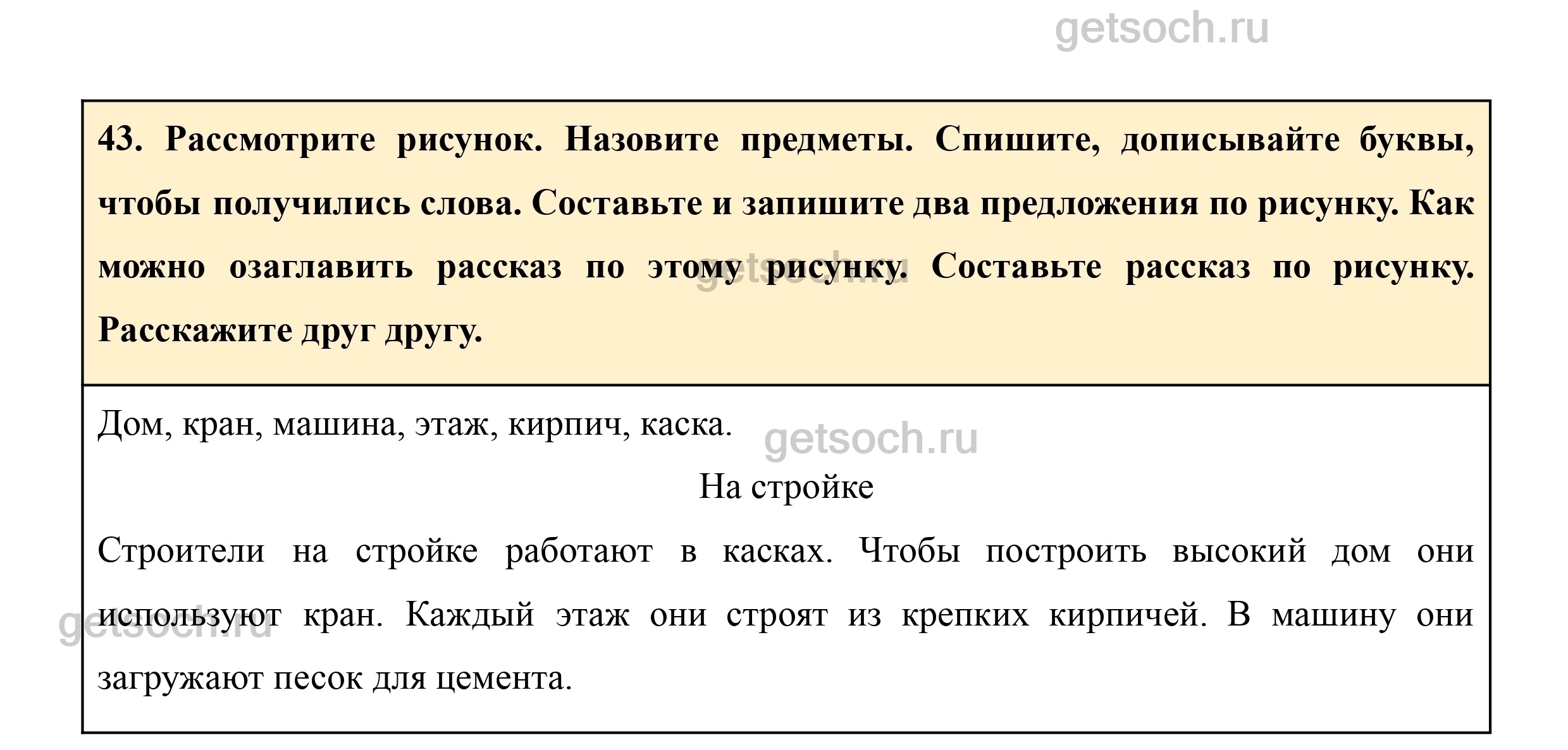 43. Рассмотрите рисунок. Назовите предметы. Спишите, дописывайте буквы, чтобы получились слова. Составьте и запишите два предложения по рисунку. Как можно озаглавить рассказ по этому рисунку. Составьте рассказ по рисунку. Расскажите друг другу.