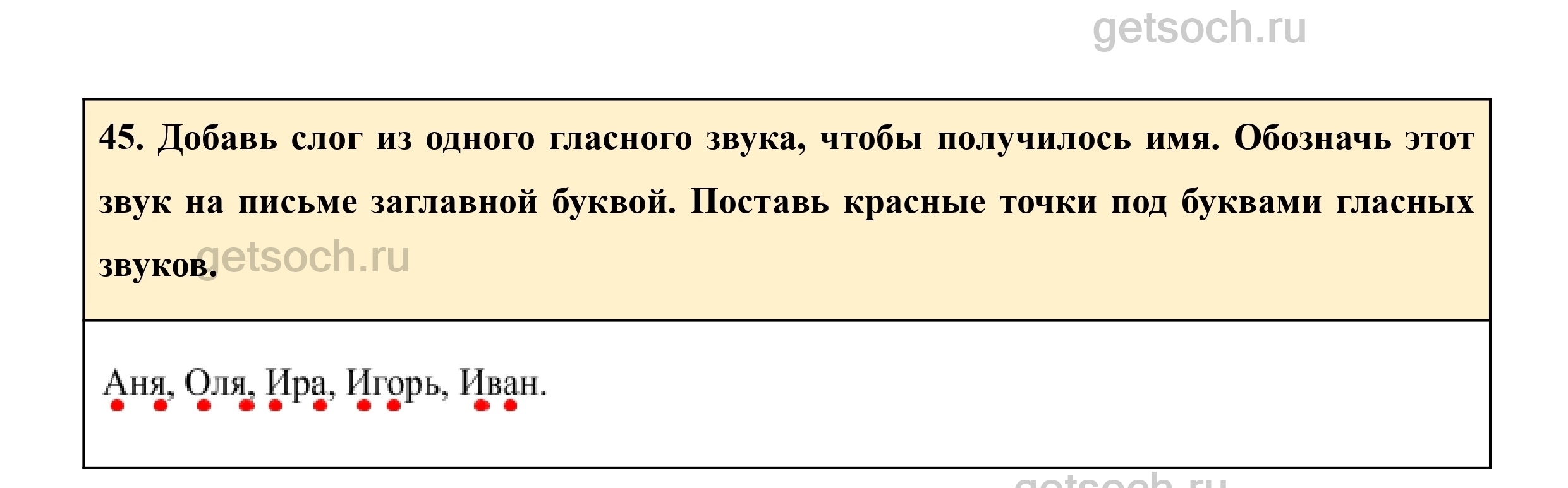 45. Добавь слог из одного гласного звука, чтобы получилось имя. Обозначь этот звук на письме заглавной буквой. Поставь красные точки под буквами гласных звуков.