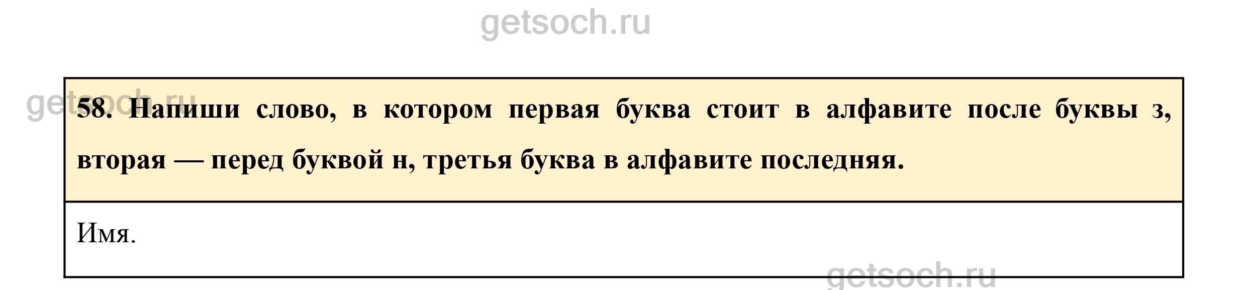 58. Напиши слово, в котором первая буква стоит в алфавите после буквы з, вторая — перед буквой н, третья буква в алфавите последняя.