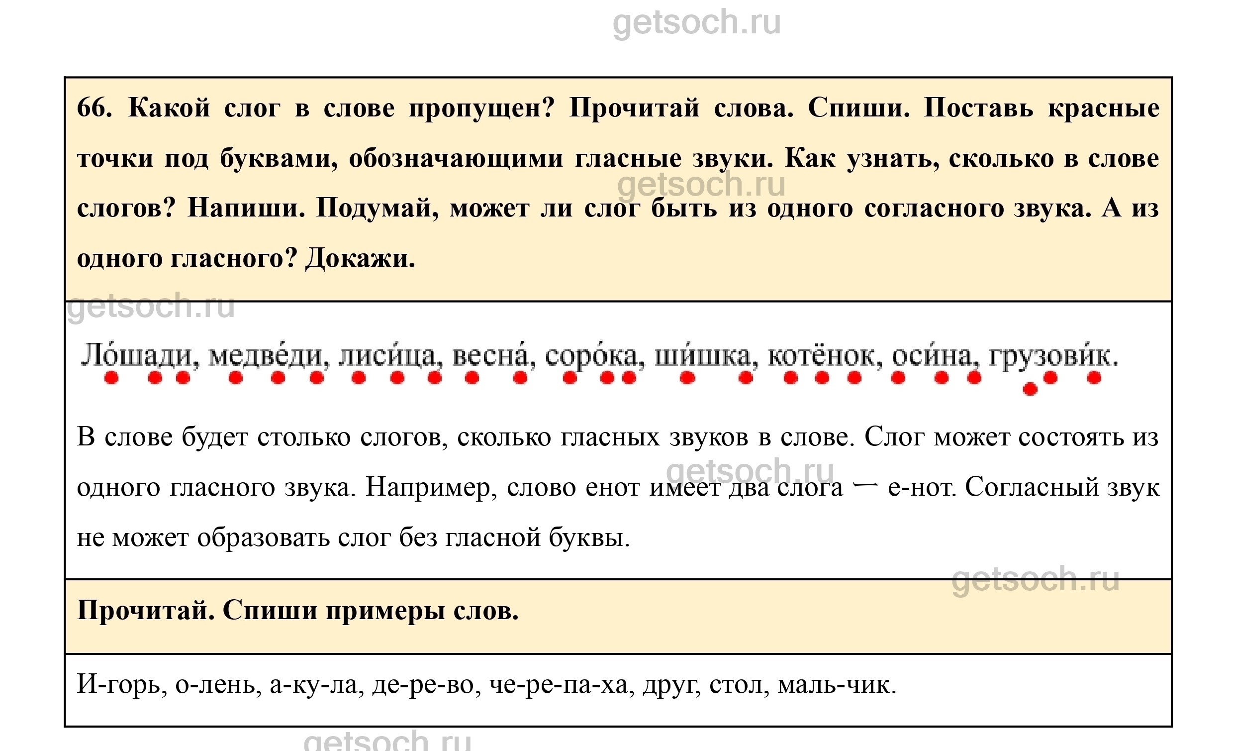 66. Какой слог в слове пропущен? Прочитай слова. Спиши. Поставь красные точки под буквами, обозначающими гласные звуки. Как узнать, сколько в слове слогов? Напиши. Подумай, может ли слог быть из одного согласного звука. А из одного гласного? Докажи.