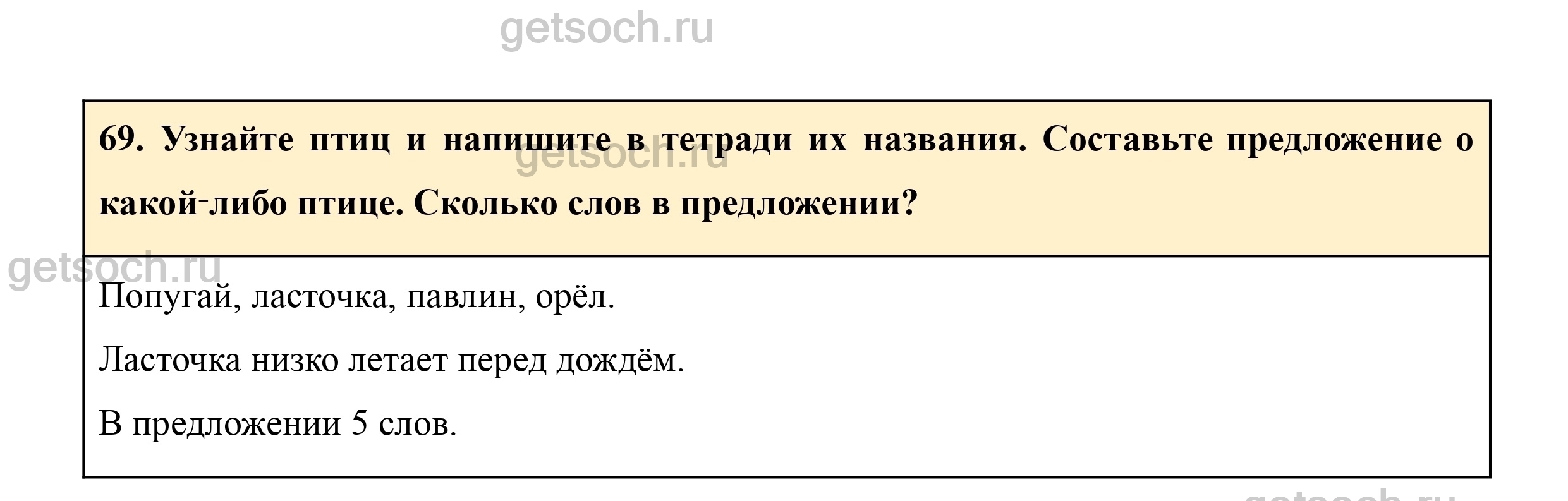 69. Узнайте птиц и напишите в тетради их названия. Составьте предложение о какой‑либо птице. Сколько слов в предложении?