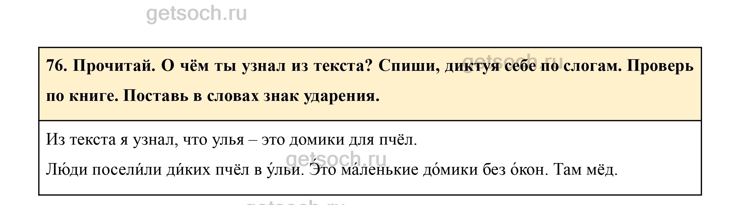 76. Прочитай. О чём ты узнал из текста? Спиши, диктуя себе по слогам. Проверь по книге. Поставь в словах знак ударения.