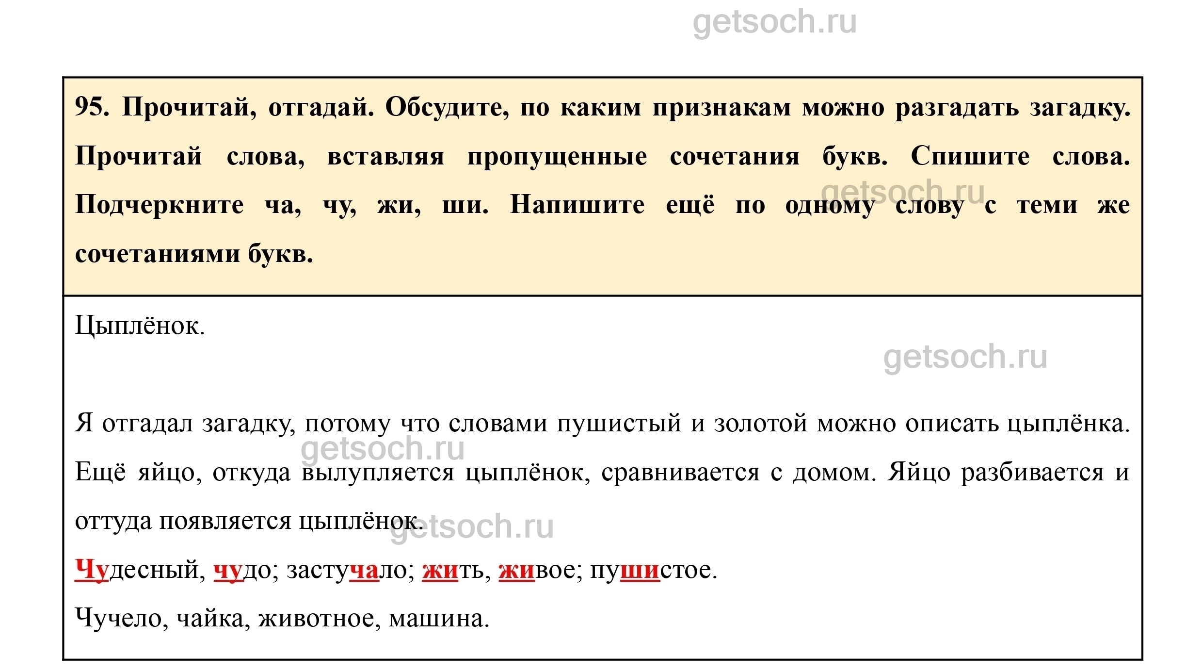 95. Прочитай, отгадай. Обсудите, по каким признакам можно разгадать загадку. Прочитай слова, вставляя пропущенные сочетания букв. Спишите слова. Подчеркните ча, чу, жи, ши. Напишите ещё по одному слову с теми же сочетаниями букв.