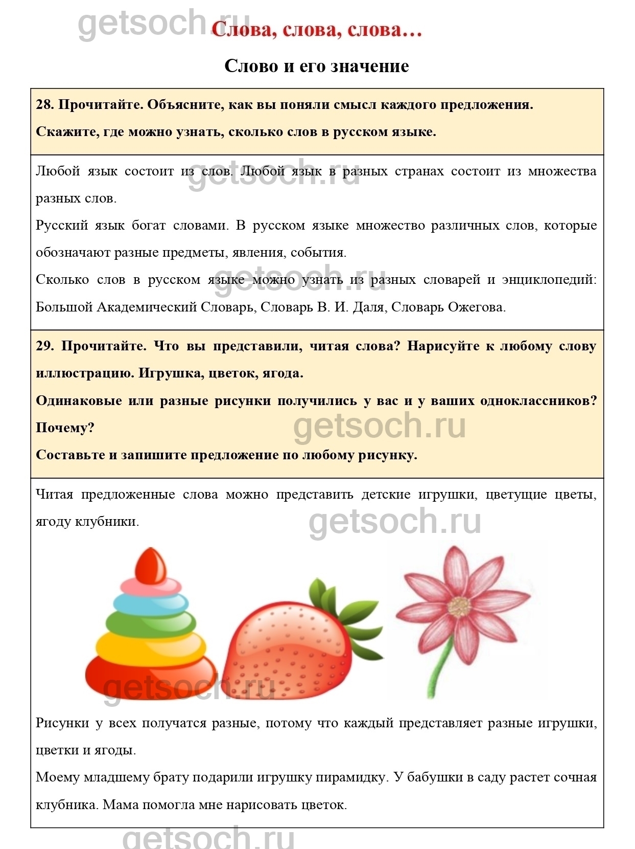 “29. Прочитайте. Что вы представили, читая слова? Нарисуйте к любому слову иллюстрацию. Игрушка, цветок, ягода.