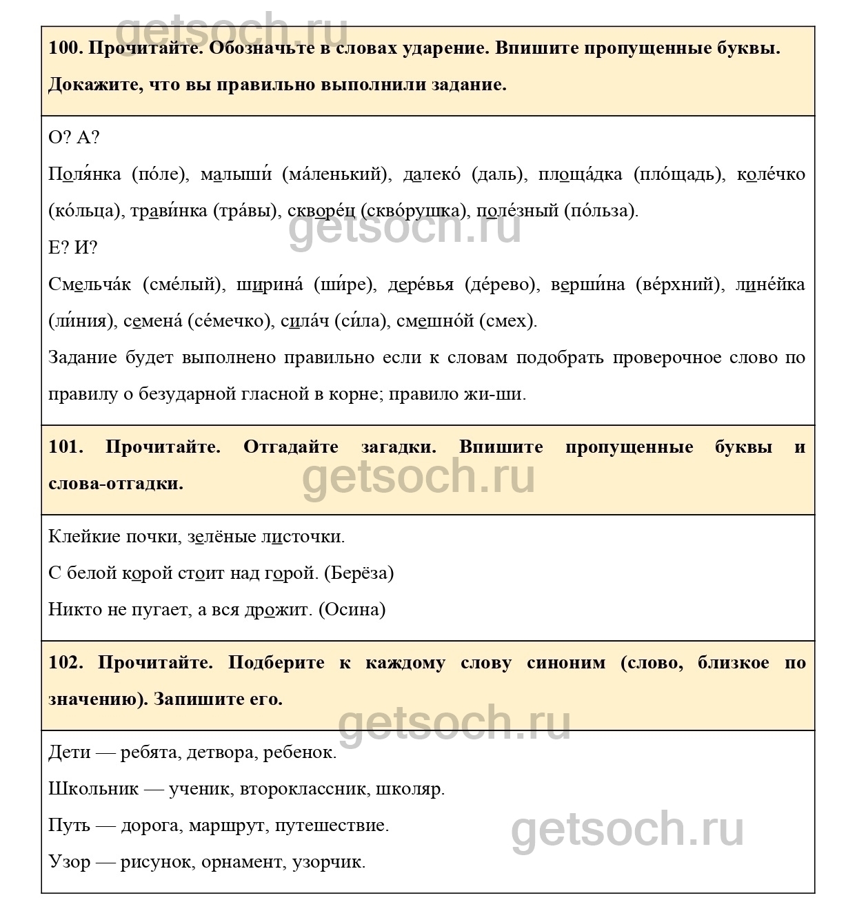 “100. Прочитайте. Обозначьте в словах ударение. Впишите пропущенные буквы.