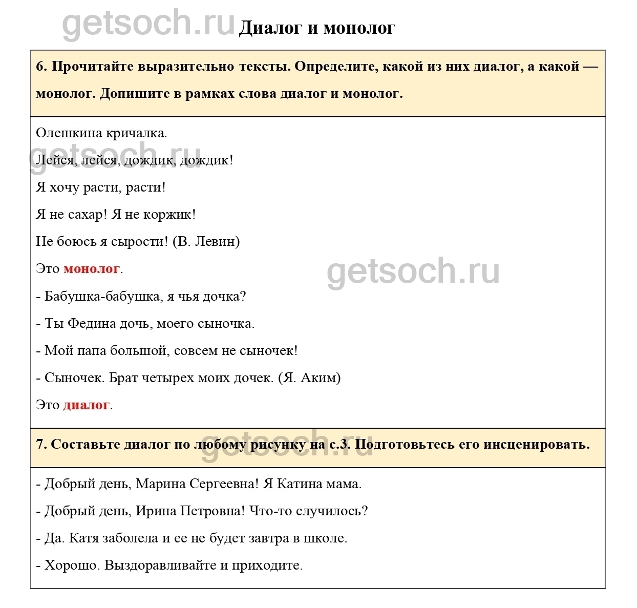 6. Прочитайте выразительно тексты. Определите, какой из них диалог, а какой — монолог. Допишите в рамках слова диалог и монолог.