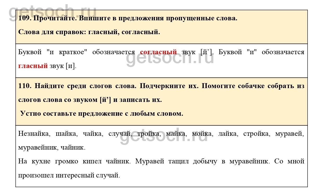 “110. Найдите среди слогов слова. Подчеркните их. Помогите собачке собрать из слогов слова со звуком [й’] и записать их.