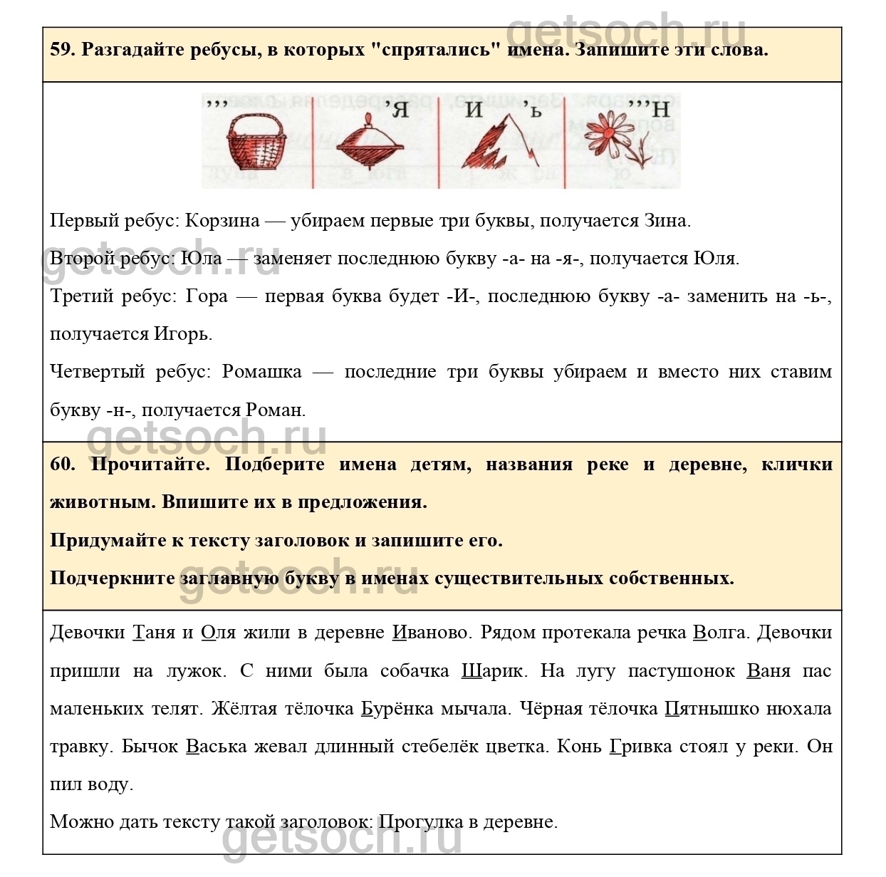 “60. Прочитайте. Подберите имена детям, названия реке и деревне, клички животным. Впишите их в предложения.
