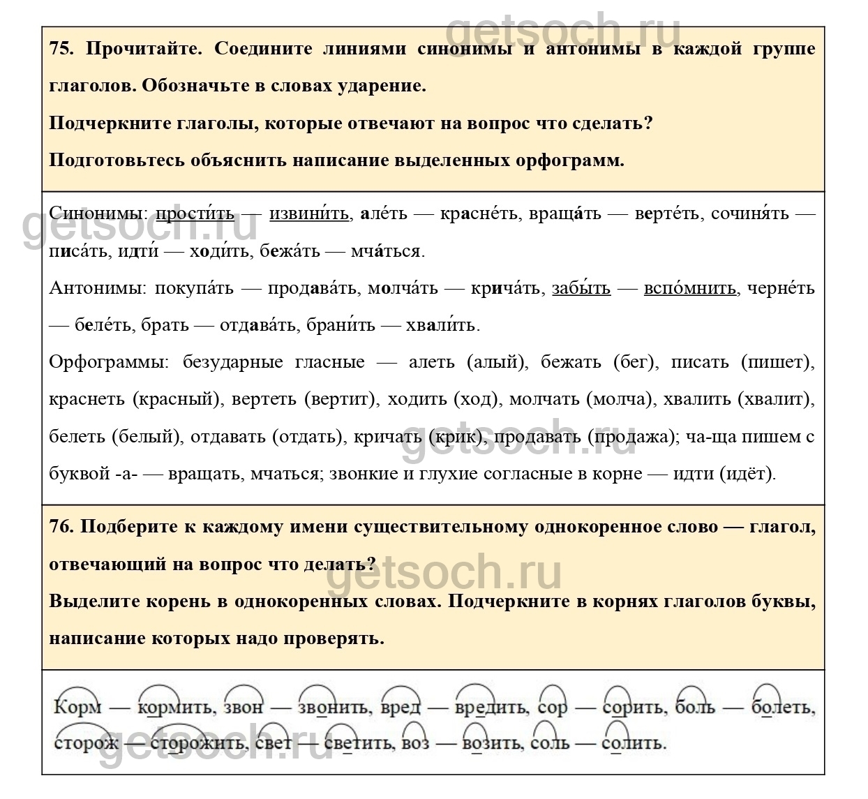 “75. Прочитайте. Соедините линиями синонимы и антонимы в каждой группе глаголов. Обозначьте в словах ударение.