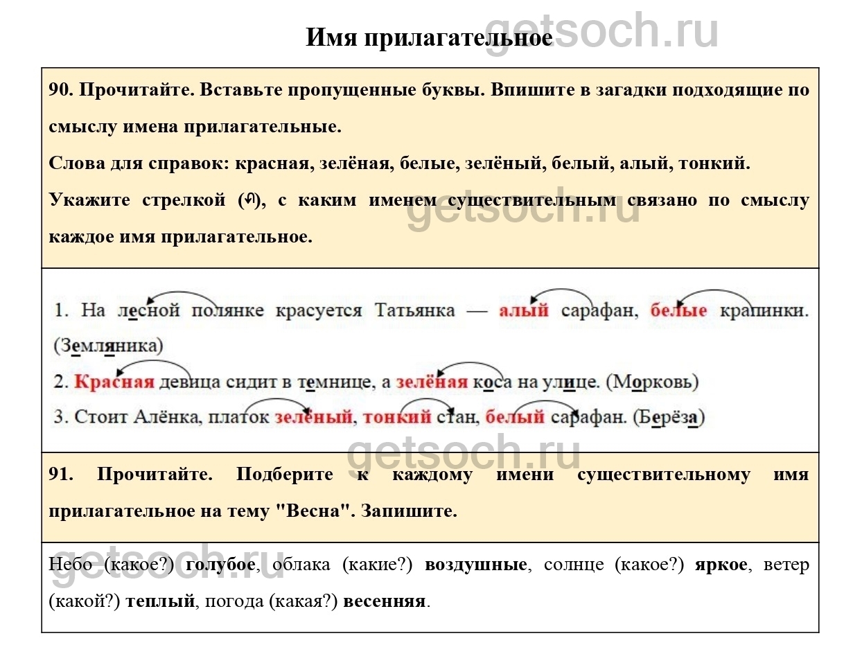 “90. Прочитайте. Вставьте пропущенные буквы. Впишите в загадки подходящие по смыслу имена прилагательные.