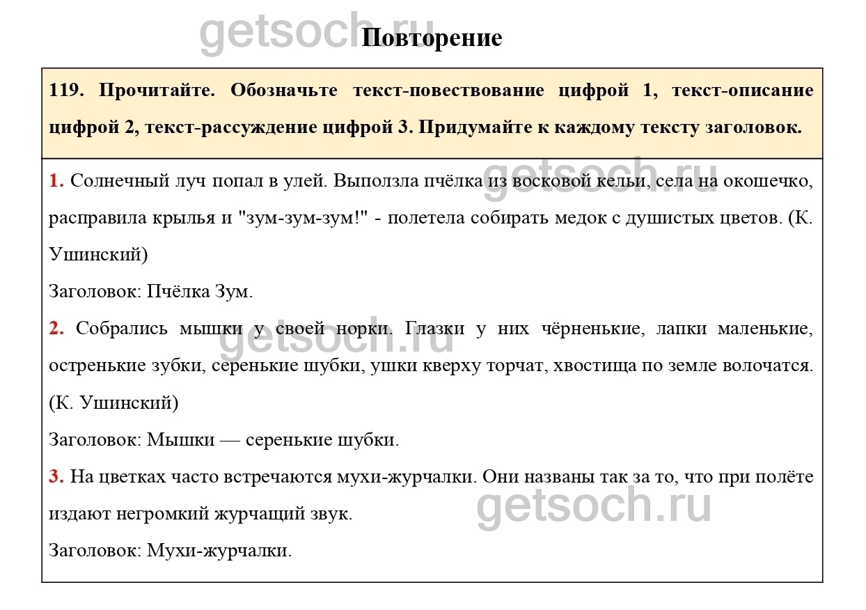 119. Прочитайте. Обозначьте текст-повествование цифрой 1, текст-описание цифрой 2, текст-рассуждение цифрой 3. Придумайте к каждому тексту заголовок.