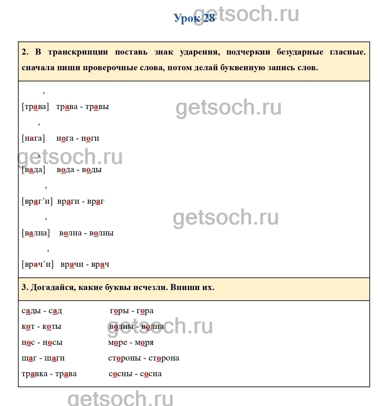 Рассмотрим ответы на задания рабочей тетради по русскому языку для 2 класса Кузнецова Страница 102. В транскрипции поставь знак ударения, подчеркни безударные гласные. сначала пиши проверочные слова, потом делай буквенную запись слов.