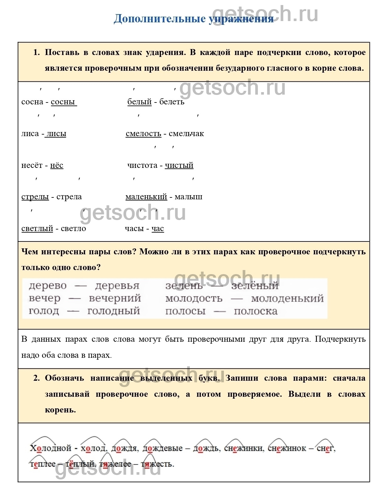 Рассмотрим ответы на задания рабочей тетради по русскому языку для 2 класса Кузнецова Страница 100Поставь в словах знак ударения. В каждой паре подчеркни слово, которое является проверочным при обозначении безударного гласного в корне слова.