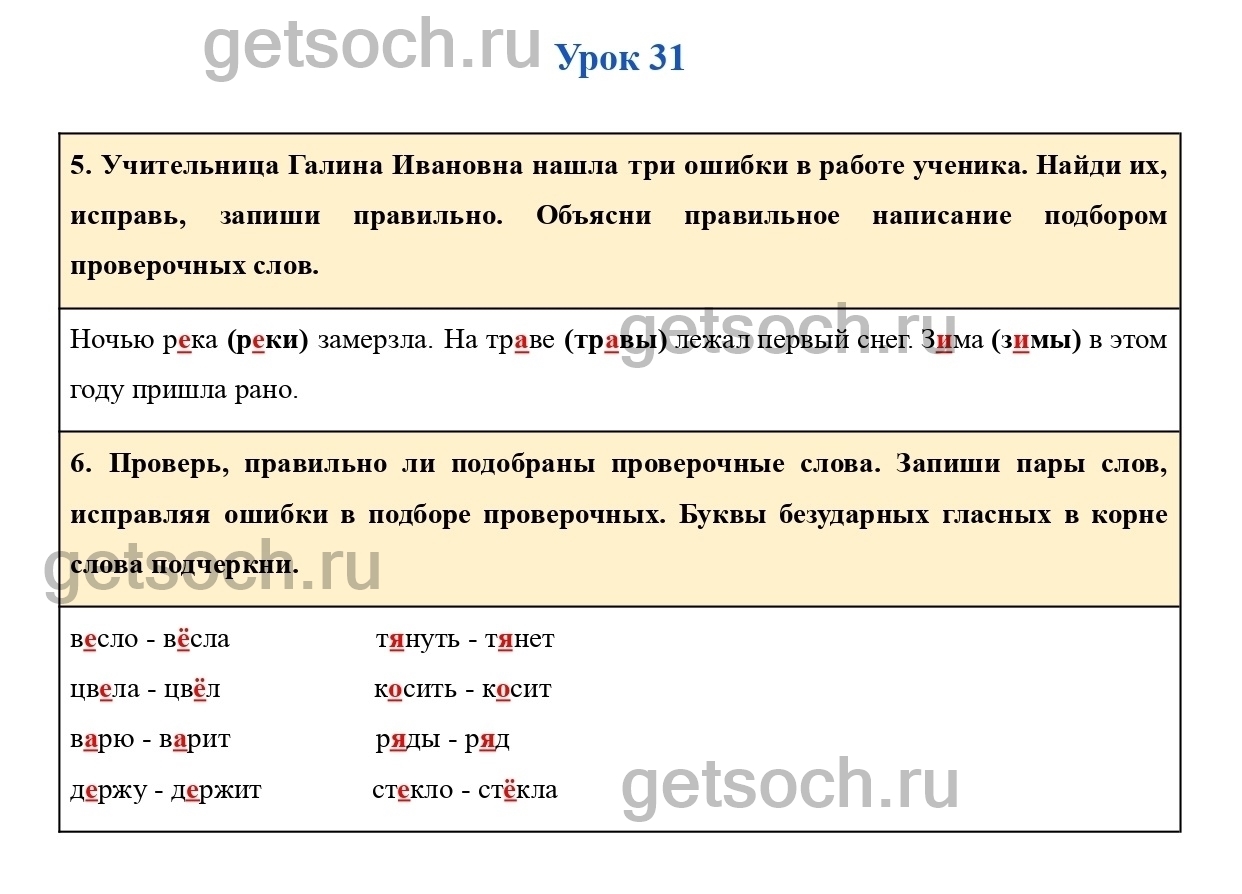6. Проверь, правильно ли подобраны проверочные слова. Запиши пары слов, исправляя ошибки в подборе проверочных. Буквы безударных гласных в корне слова подчеркни.