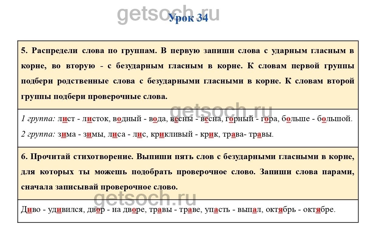 Рассмотрим ответы на задания рабочей тетради по русскому языку для 2 класса Кузнецова Страница 235. Распредели слова по группам. В первую запиши слова с ударным гласным в корне, во вторую – с безударным гласным в корне. К словам первой группы подбери родственные слова с безударными гласными в корне. К словам второй группы подбери проверочные слова.