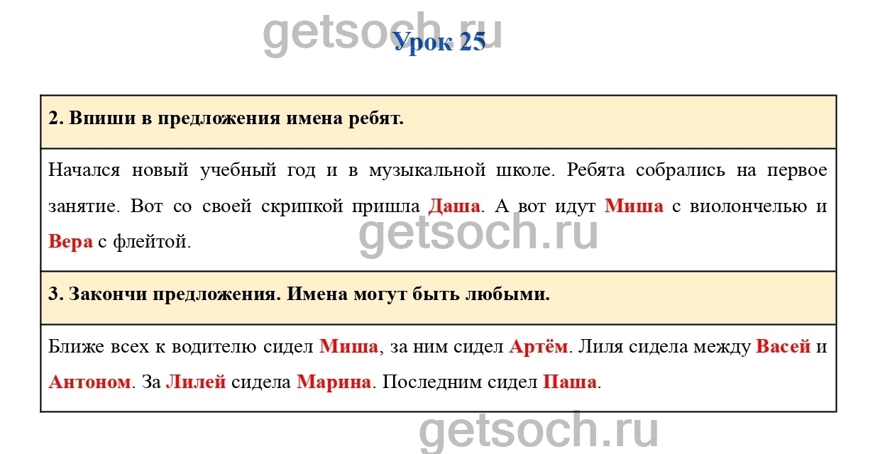 Рассмотрим ответы на задания рабочей тетради по русскому языку для 2 класса Кузнецова Страница 42. Впиши в предложения имена ребят.