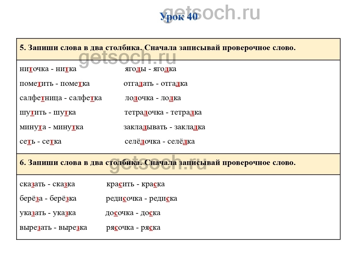 Рассмотрим ответы на задания рабочей тетради по русскому языку для 2 класса Кузнецова Страница 405. Запиши слова в два столбика. Сначала записывай проверочное слово.