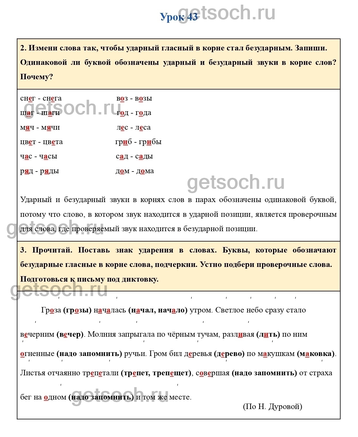 Рассмотрим ответы на задания рабочей тетради по русскому языку для 2 класса Кузнецова Страница 46″2. Измени слова так, чтобы ударный гласный в корне стал безударным. Запиши.