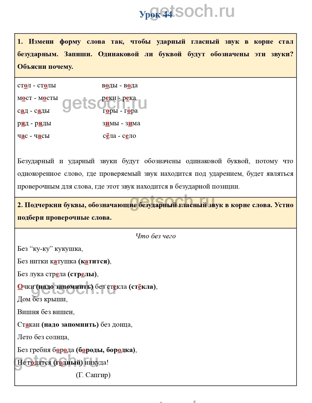 Рассмотрим ответы на задания рабочей тетради по русскому языку для 2 класса Кузнецова Страница 491. Измени форму слова так, чтобы ударный гласный звук в корне стал безударным. Запиши. Одинаковой ли буквой будут обозначены эти звуки? Объясни почему.