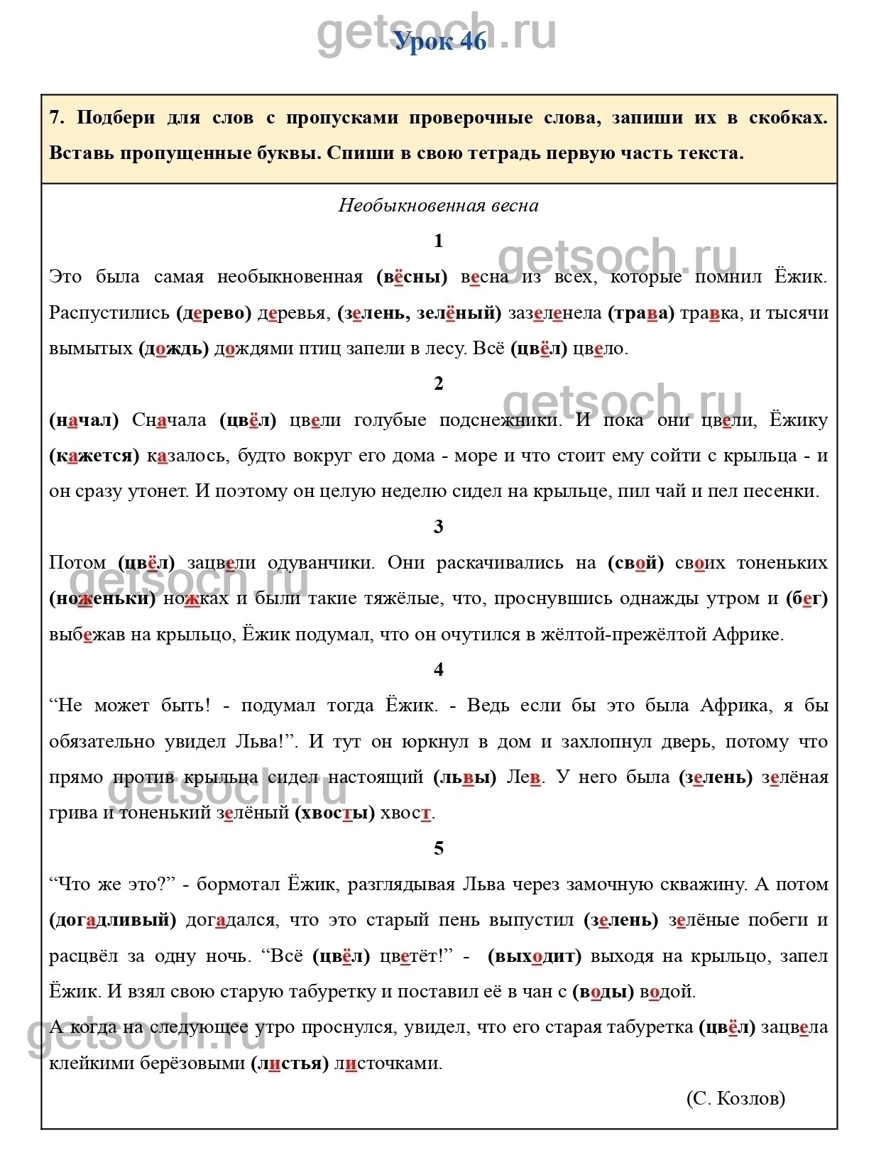 Рассмотрим ответы на задания рабочей тетради по русскому языку для 2 класса Кузнецова Страница 59-607. Подбери для слов с пропусками проверочные слова, запиши их в скобках. Вставь пропущенные буквы. Спиши в свою тетрадь первую часть текста.