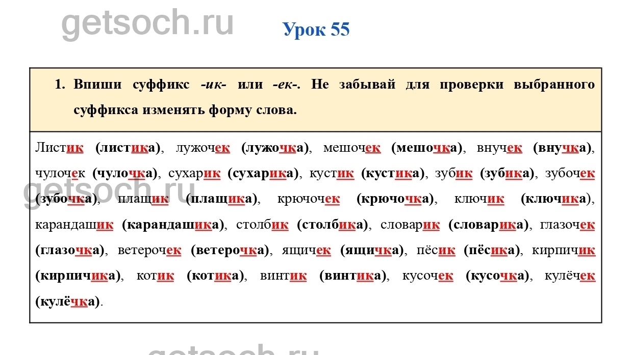Рассмотрим ответы на задания рабочей тетради по русскому языку для 2 класса Кузнецова Страница 72Впиши суффикс -ик- или -ек-. Не забывай для проверки выбранного суффикса изменять форму слова.