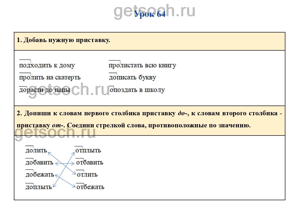 2. Допиши к словам первого столбика приставку до-, к словам второго столбика – приставку от-. Соедини стрелкой слова, противоположные по значению.