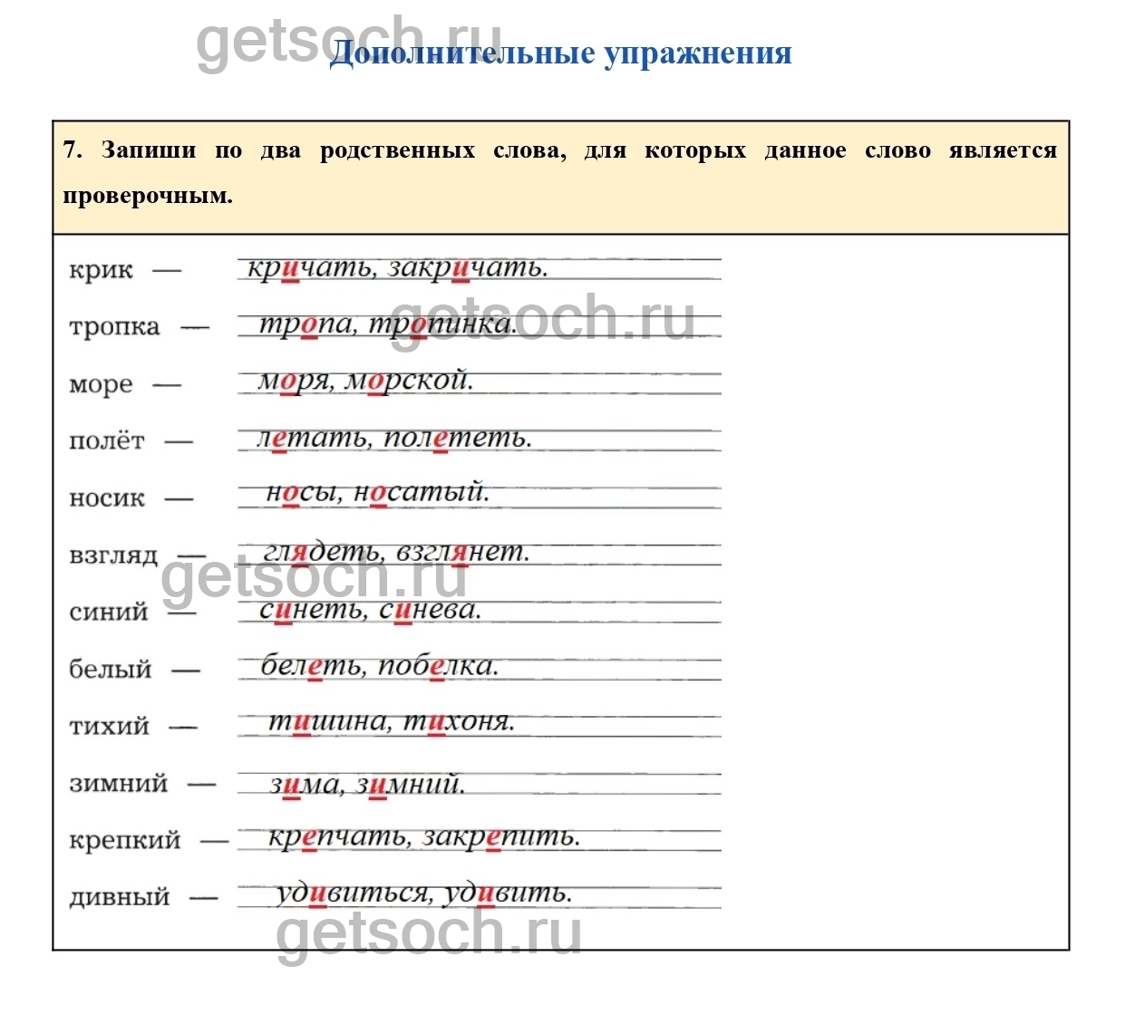 Рассмотрим ответы на задания рабочей тетради по русскому языку для 2 класса Кузнецова Страница 507. Запиши по два родственных слова, для которых данное слово является проверочным.