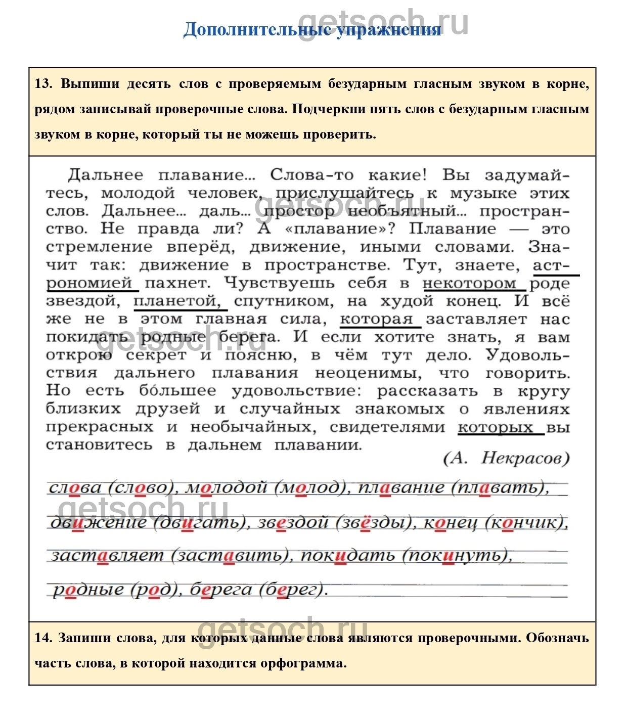 14. Запиши слова, для которых данные слова являются проверочными. Обозначь часть слова, в которой находится орфограмма.