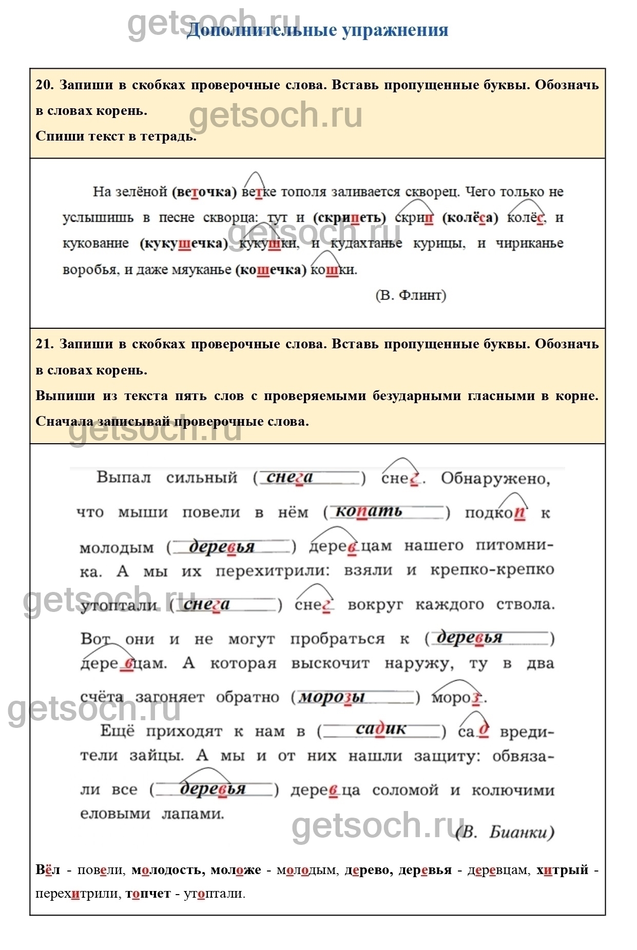 “21. Запиши в скобках проверочные слова. Вставь пропущенные буквы. Обозначь в словах корень.