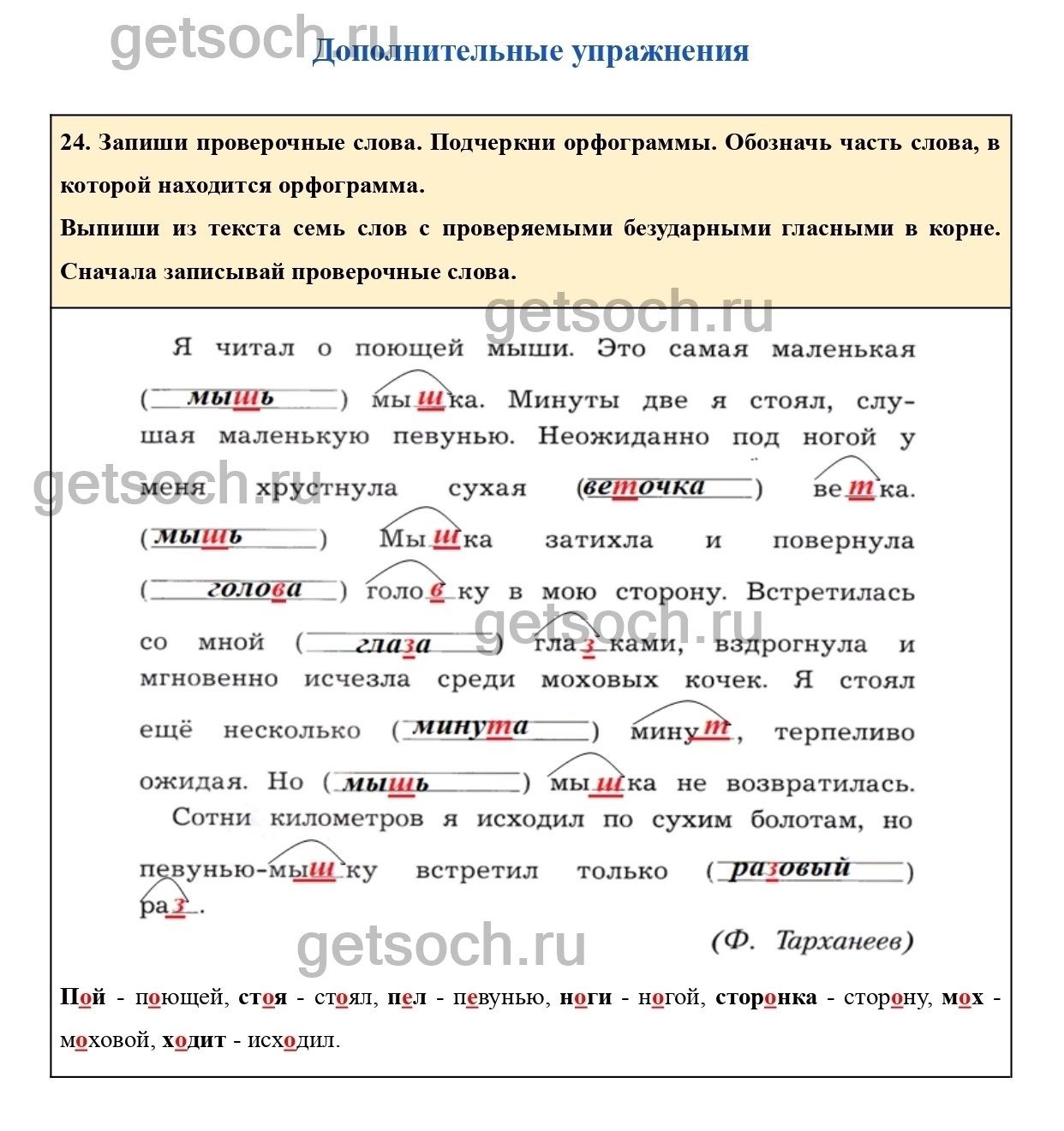 Рассмотрим ответы на задания рабочей тетради по русскому языку для 2 класса Кузнецова Страница 6424. Запиши проверочные слова. Подчеркни орфограммы. Обозначь часть слова, в которой находится орфограмма.