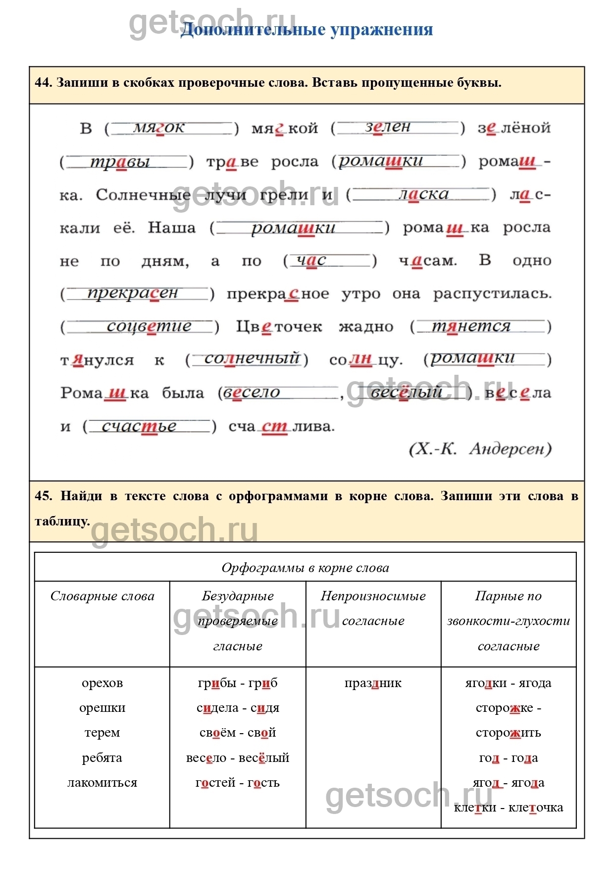 45. Найди в тексте слова с орфограммами в корне слова. Запиши эти слова в таблицу.