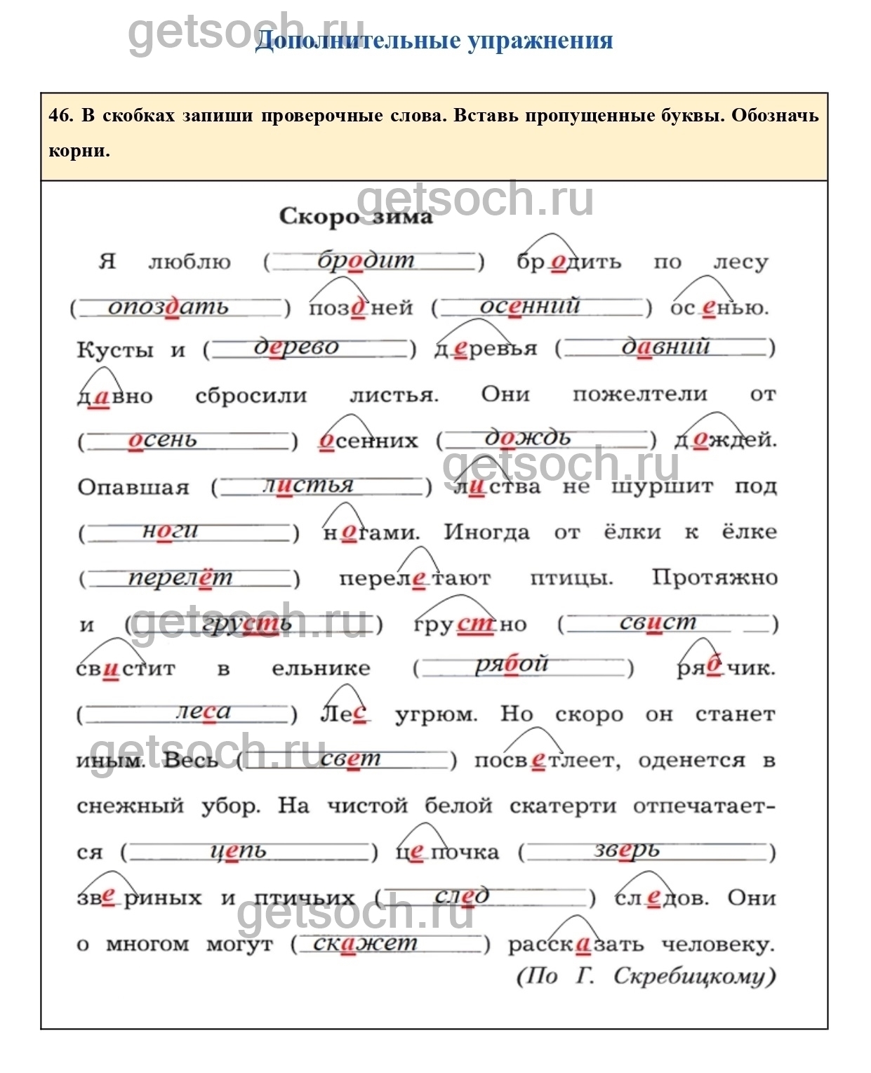 Рассмотрим ответы на задания рабочей тетради по русскому языку для 2 класса Кузнецова Страница 80-8146. В скобках запиши проверочные слова. Вставь пропущенные буквы. Обозначь корни.