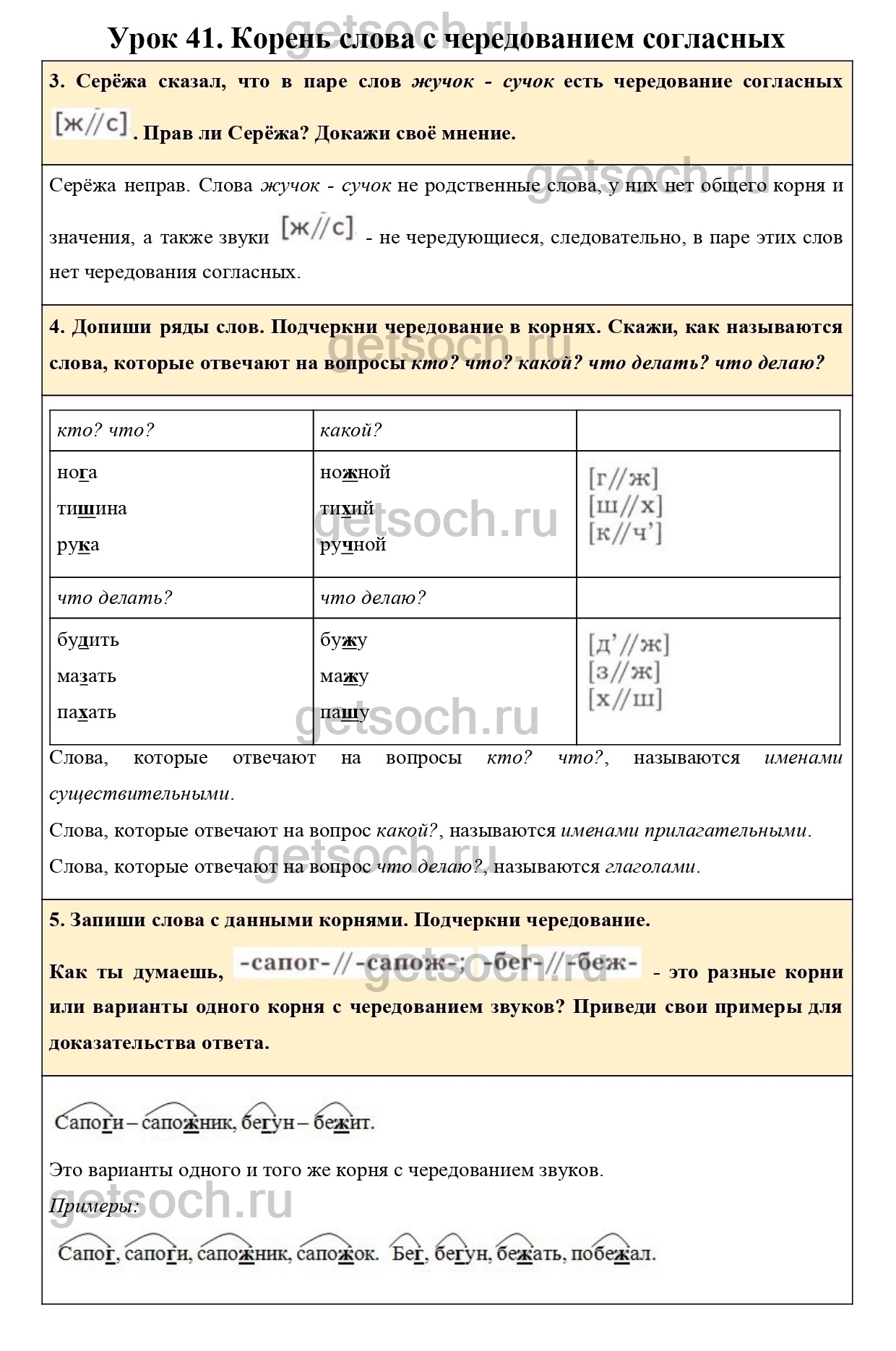 4. Допиши ряды слов. Подчеркни чередование в корнях. Скажи, как называются слова, которые отвечают на вопросы кто? что? какой? что делать? что делаю?
