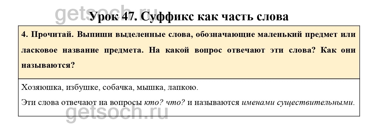 4. Прочитай. Выпиши выделенные слова, обозначающие маленький предмет или ласковое название предмета. На какой вопрос отвечают эти слова? Как они называются?
