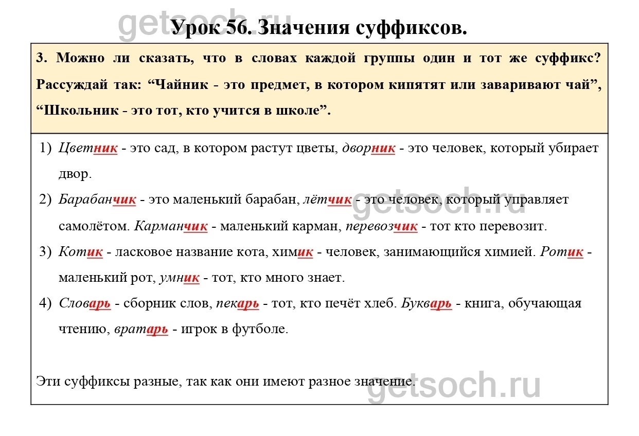 3. Можно ли сказать, что в словах каждой группы один и тот же суффикс? Рассуждай так: “Чайник – это предмет, в котором кипятят или заваривают чай”, “Школьник – это тот, кто учится в школе”.