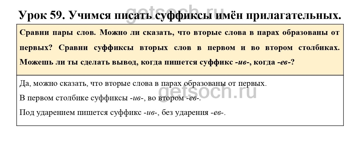 Сравни пары слов. Можно ли сказать, что вторые слова в парах образованы от первых? Сравни суффиксы вторых слов в первом и во втором столбиках. Можешь ли ты сделать вывод, когда пишется суффикс -ив-, когда -ев-?