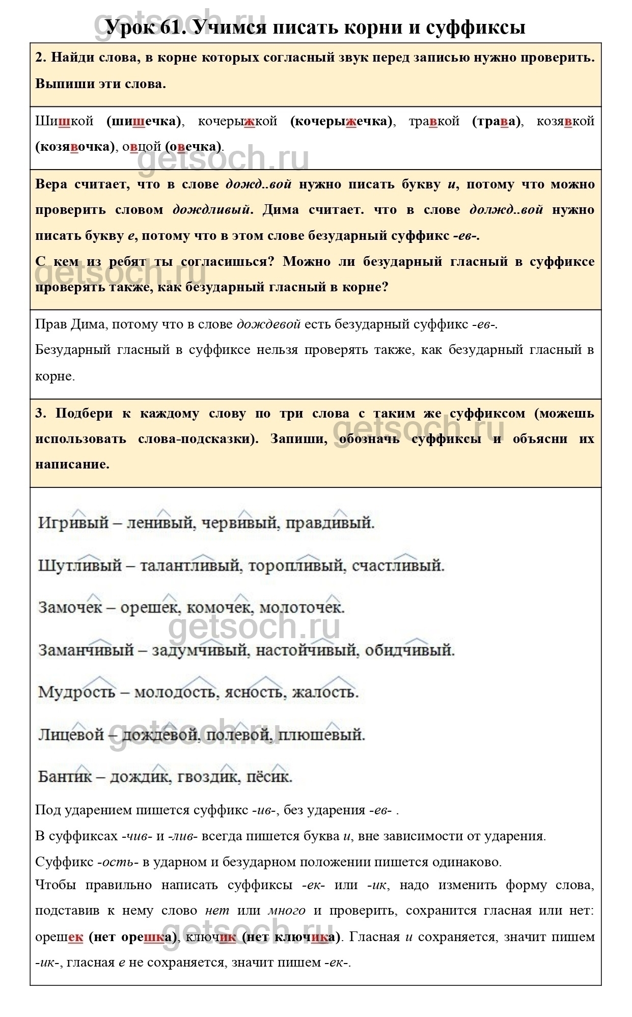 3. Подбери к каждому слову по три слова с таким же суффиксом (можешь использовать слова-подсказки). Запиши, обозначь суффиксы и объясни их написание.