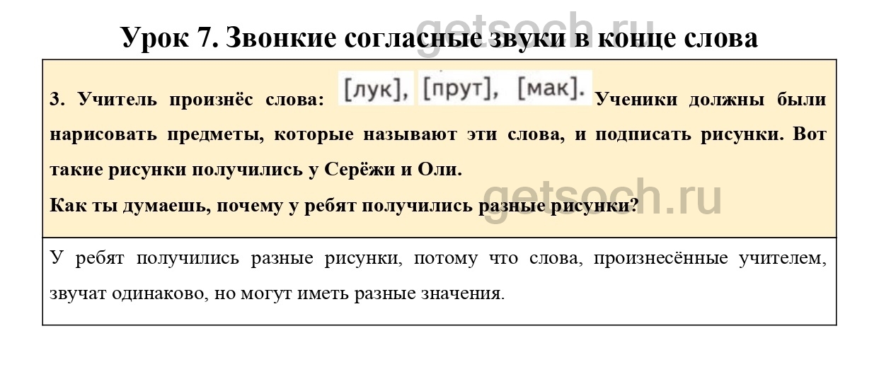 3. Учитель произнёс слова: Ученики должны были нарисовать предметы, которые называют эти слова, и подписать рисунки. Вот такие рисунки получились у Серёжи и Оли.