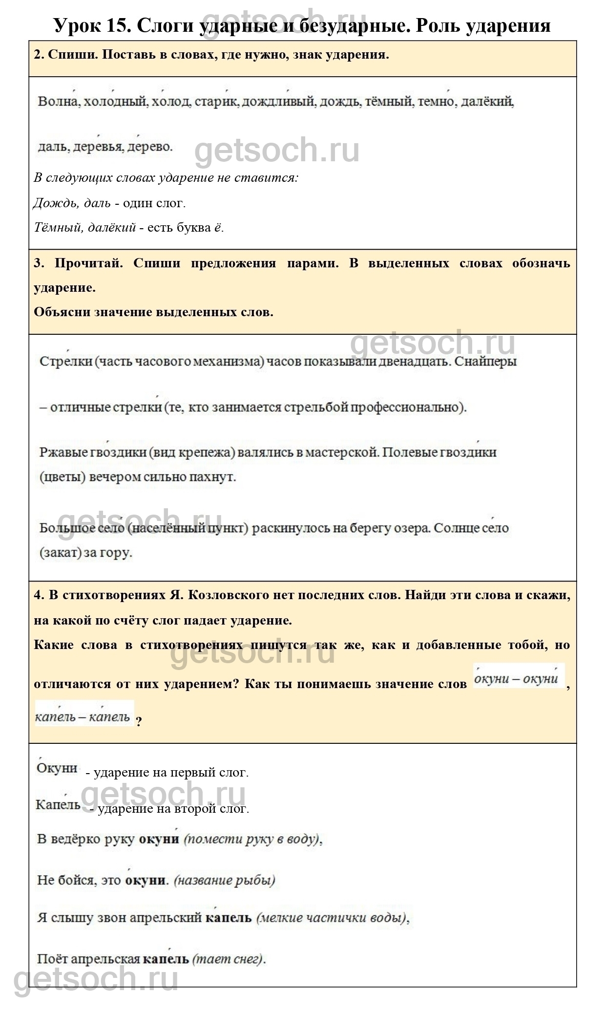 “4. В стихотворениях Я. Козловского нет последних слов. Найди эти слова и скажи, на какой по счёту слог падает ударение.