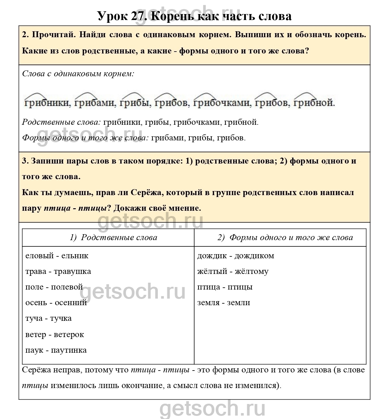 2. Прочитай. Найди слова с одинаковым корнем. Выпиши их и обозначь корень. Какие из слов родственные, а какие – формы одного и того же слова?