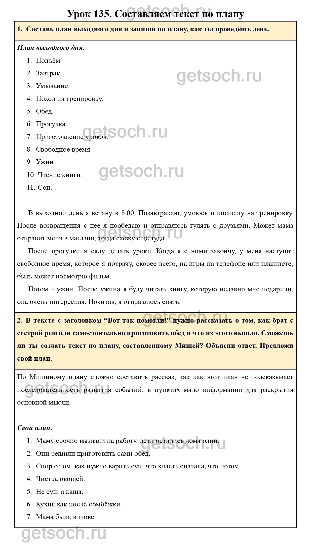 2. В тексте с заголовком “Вот так помогли!” нужно рассказать о том, как брат с сестрой решили самостоятельно приготовить обед и что из этого вышло. Сможешь ли ты создать текст по плану, составленному Мишей? Объясни ответ. Предложи свой план.