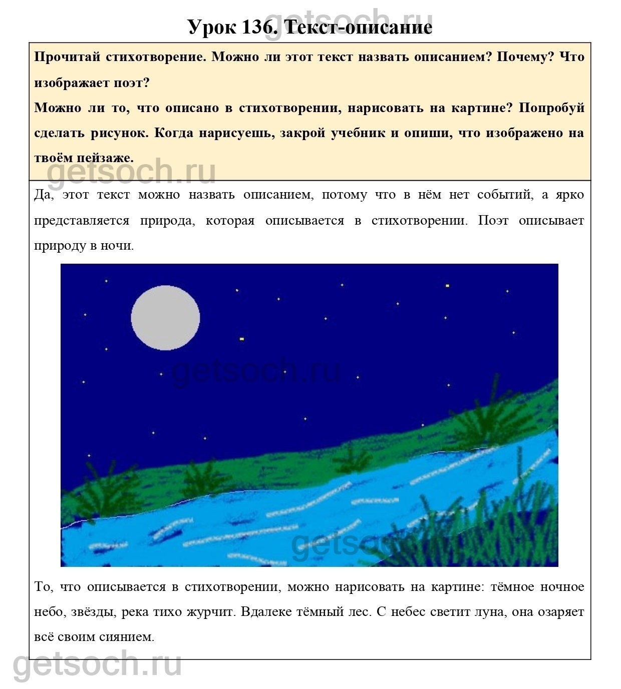 Можно ли то, что описано в стихотворении, нарисовать на картине? Попробуй сделать рисунок. Когда нарисуешь, закрой учебник и опиши, что изображено на твоём пейзаже.”