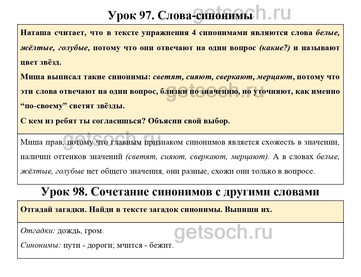 “Наташа считает, что в тексте упражнения 4 синонимами являются слова белые, жёлтые, голубые, потому что они отвечают на один вопрос (какие?) и называют цвет звёзд.