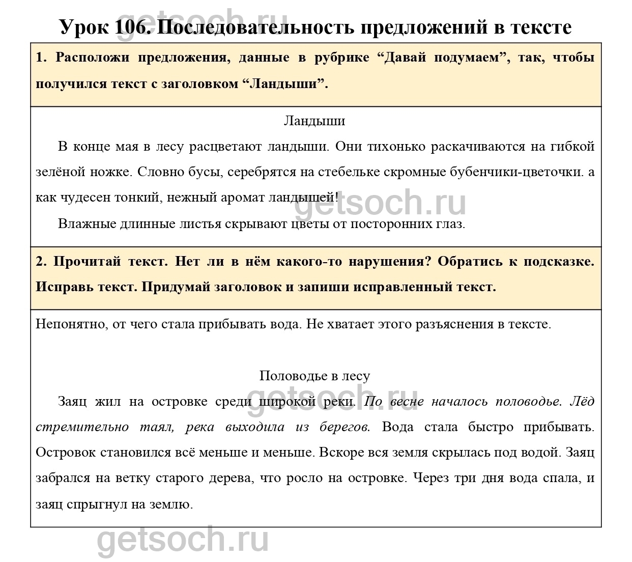 1. Расположи предложения, данные в рубрике “Давай подумаем”, так, чтобы получился текст с заголовком “Ландыши”.